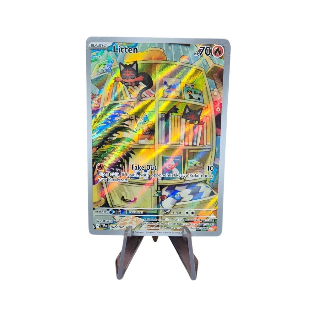 Add the Temporal Forces Litten (167/162) Illustration Rare Foil/Holo to your collection today — a fiery secret rare that shines with style and nostalgia.